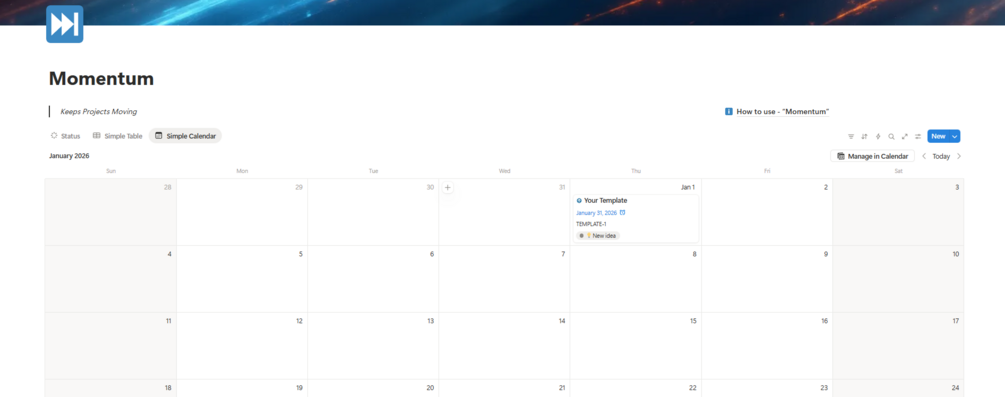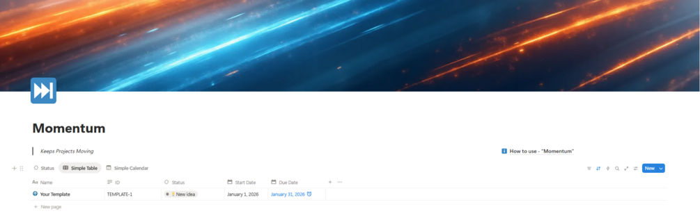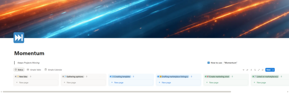 Momentum is a simple but powerful project tracker built for digital creators. Organize content ideas, manage workflows, and keep production on track—all in one streamlined Notion dashboard.